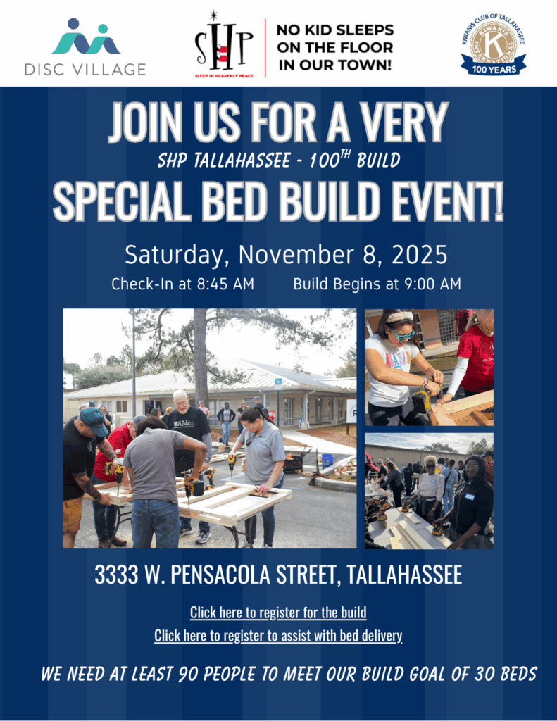 Join DISC Village for the Sleep in Heavenly Peace Bed Build to help build beds for children in need. Assist with delivery, building, or donate new twin-size sheets, pillows, and bedding items to support local families.